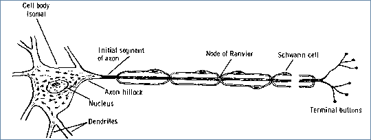 A typical spinal motor neuron has 5 -7 processes called dendrites which extend out from the cell body and branch out extensively. It also has along fibrous axon which originates from a somewhat thickened area of the cell body, the axon hillock. A short distance from it's origin, the axon acquires a sheath of myelin, a protein- lipid complex made up of many layers of unit membrane. The myelin sheath envelopes the axon except at its ending and at periodic constrictions about 1mm apart called nodes of Ranvier. The axon ends in a number of synaptic knobs. These knobs contain granules in which the synaptic transmitter secreted by the nerve is stored. Some mammalian neurons and most neurons in the invertebrates are unmyelinated; the axons are invested in Schwann cells, but there has been no rotation of the axon to produce multiple layers of myelin membrane.Motor neuron with myelinated axon.