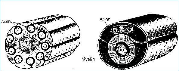Diagrammatic representation of the relation of axons to schwann cell in unmyelinated (left) and Myelinated nerve(right). In the former, the axons are simply buried in the cell. In the latter, the Schwann cell membrane is coiled many times around the axon, forming the multiple layers of membrane that make up myelin.